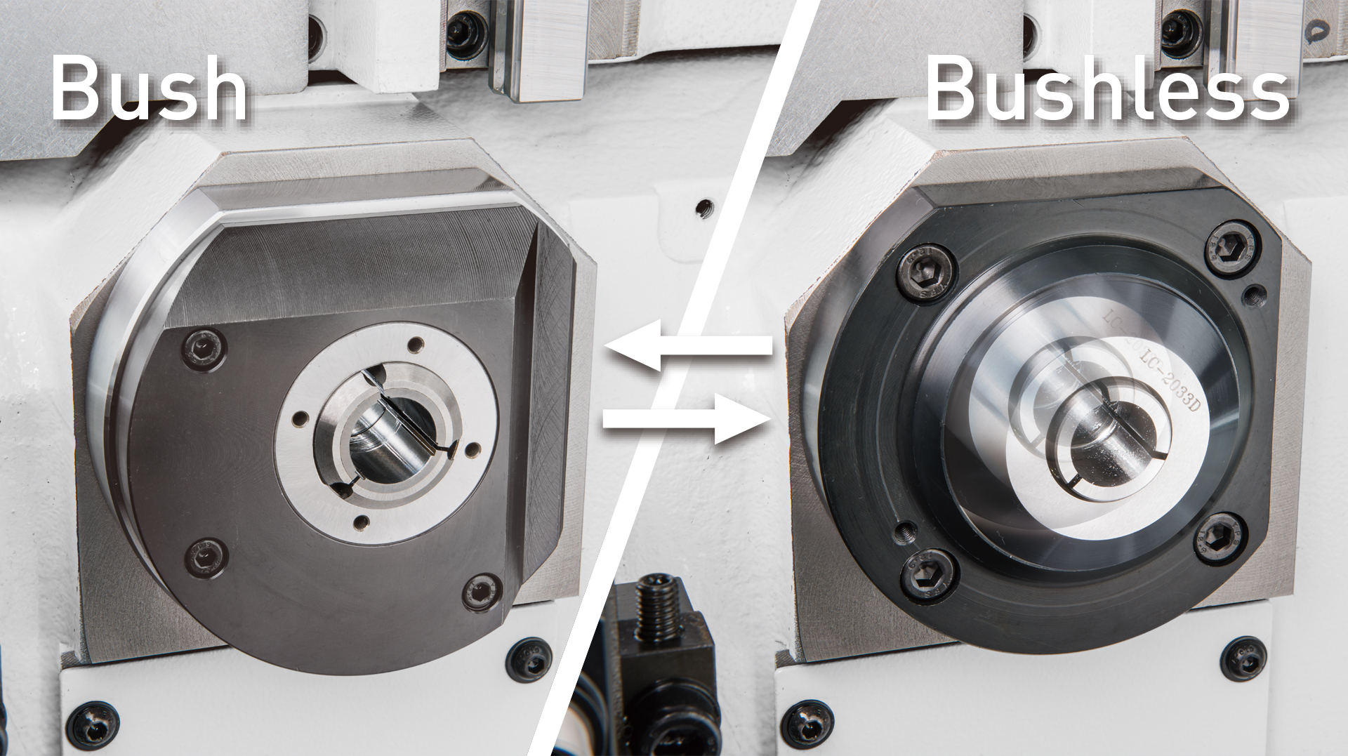 - The hybrid guide bushing design allows switching between guide bush and bushless bushing modes based on production needs.