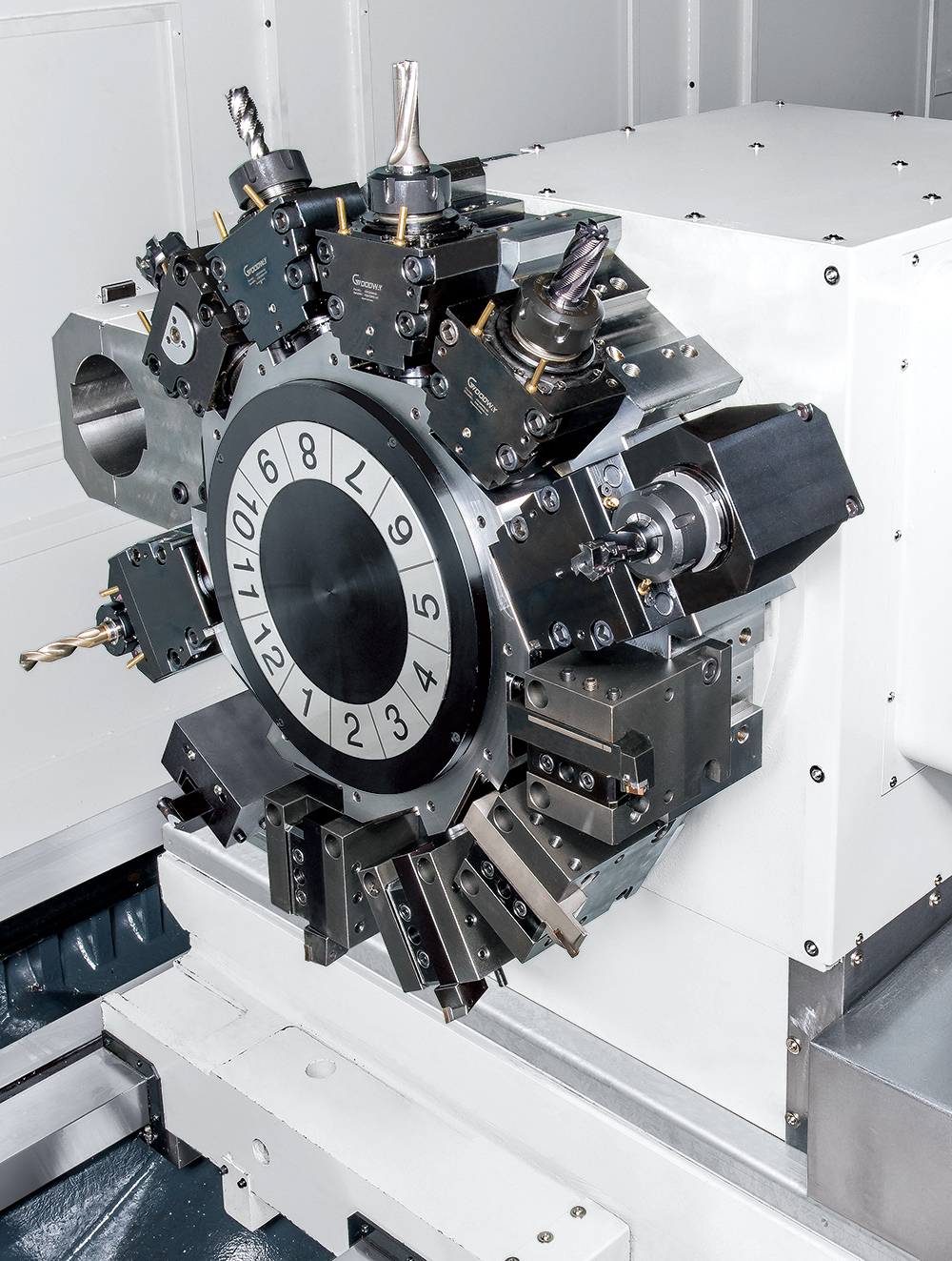 - The 12-station GOODWAY live tooling turret offers 12 stations available for live tooling, live tools rotate in working position only to reduce power loss and heat.