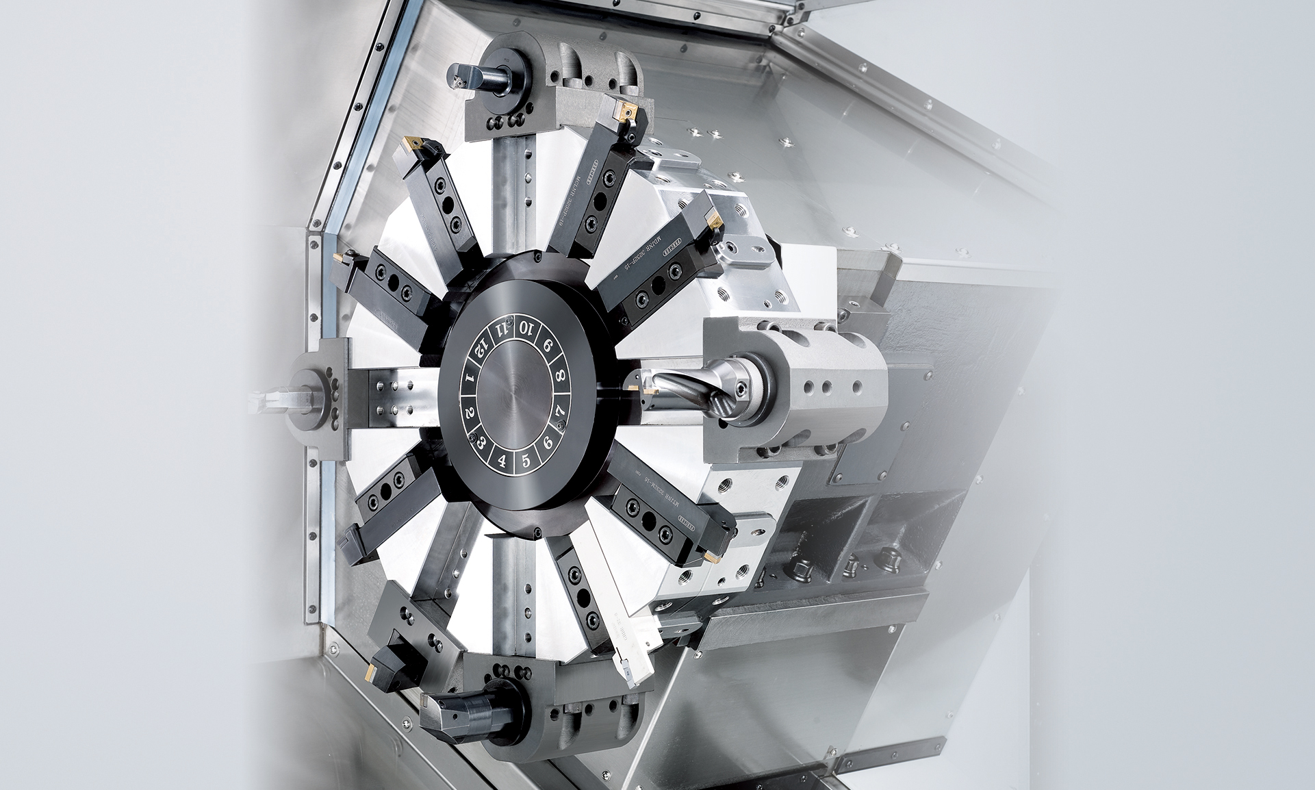 - 12-station servo-indexed turret with high rigidity and extra-large turret disk diameter.
