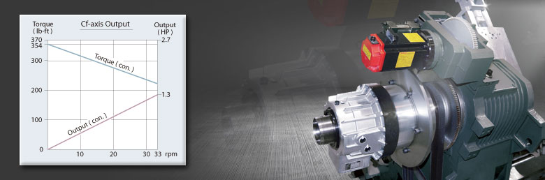 With the FANUC servo motor generating an ultra high resolution of 33,000,000 pulses per spindle rotation and 354 lb-ft of torque, surface finishes are much superior than Cs-axis ( driven by spindle motor ) equipped machines. Plus, dynamic accuracy is within ±0.02° even under heavy cutting loads.