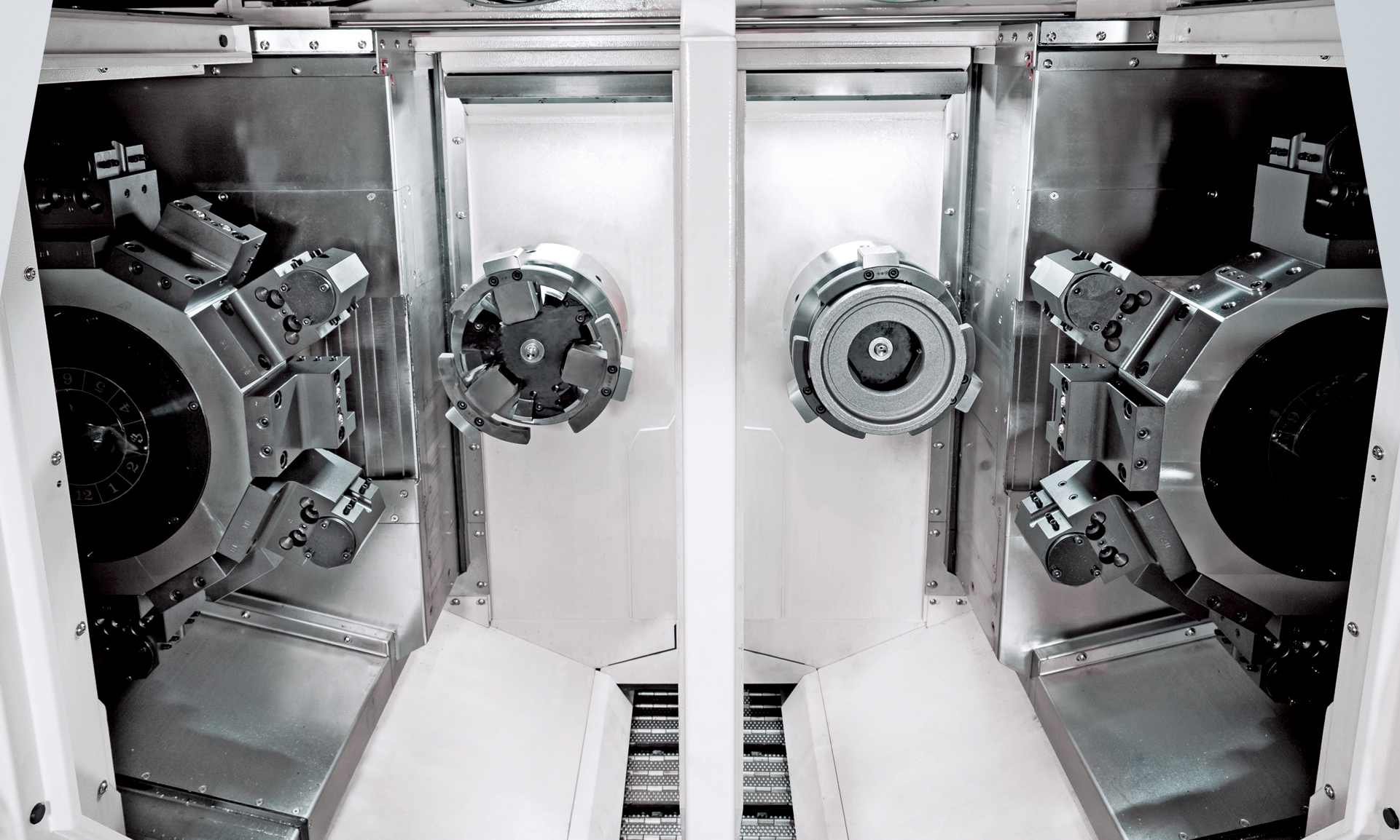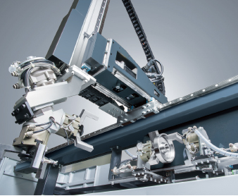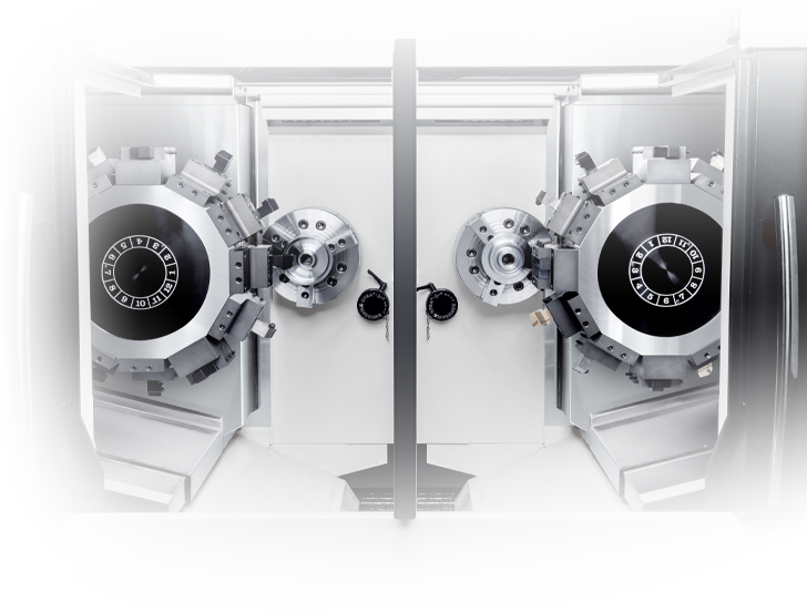 - 平行式雙主軸,雙刀塔設計;門型上下料系統為標準配備