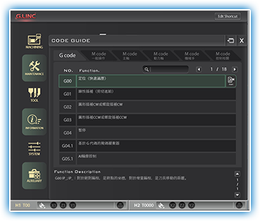 編輯加工程式時,可以查詢 G/M code 功能來輔助程式編輯
