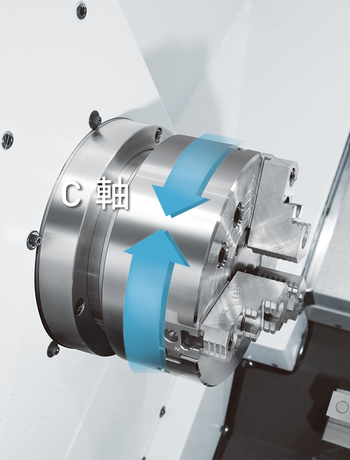 - 选配 Y 轴控制功能可进行 X、Y、Z、C 四轴同动加工,也能够在 100 mm ( 偏离中心线 ±50 mm ) 的 Y 轴行程范围内进行偏心铣削、钻孔和攻牙,并且能改善一般三轴同动加工模式下多项工程的加工精度。